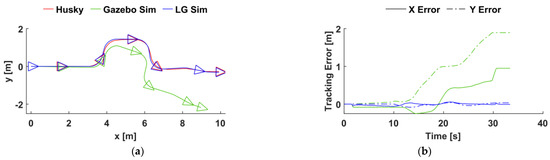 Figure 15. (a) Trajectory and (b) tracking error results of the LG and Gazebo simulations compared with experimental data for the S-bend maneuver.