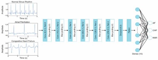 The classification layer of the 1-D CNN is a fully connected layer responsible for classifying the data. There is a flattening process before creating the fully connected layers, consisting of one hidden layer with ten nodes (Figure 1). Finally, the SoftMax activation function was applied to classify the signals into AF, CHF, and NSR.