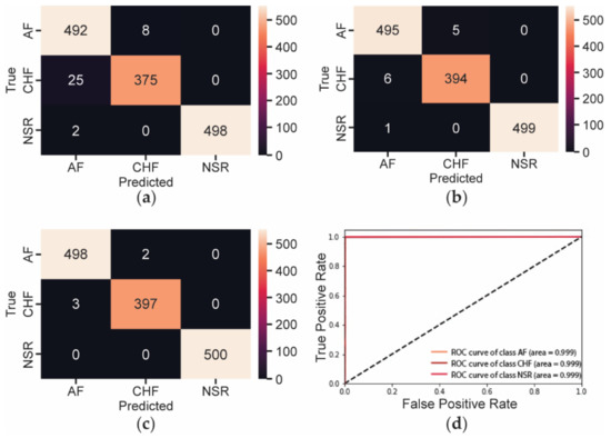 The receiver operating characteristic (ROC) curve showed the true positive rate (TPR) in y-axis against the false positive rate (FPR) in x-axis as shown in Figure 2d. As a summary of ROC curve, the area under curve (AUC) score showed the ability of the classifier to distinguish between classes. The greater the AUC score, the better the model’s ability in distinguishing between AF, CHF, and NSR conditions. As shown in Figure 2d, the AUC score was 0.999. Therefore, we can conclude that the proposed model can generalize the test datasets well.