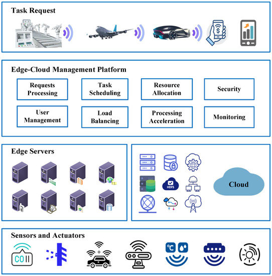As shown in Figure 1, IoT applications deal with users’ processing requirements and serve them according to their demands. Users from other devices such as machines in smart factories, and automobiles, will produce service requests, and the required metadata are provided by sensors and actuators. Edge servers will manage the underlying middleware and process data. In the edge-cloud collaborative architecture, the cloud infrastructure is responsible for the long-term storage of the processed data and application outcomes. To process data at the edge, the middleware must have the capability of real-time data handling. In this processing architecture, the connections between various types of devices (end devices, edge servers, and the cloud) are maintained mostly through industrial networks (i.e., wired/wireless network).