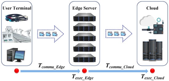 In edge-cloud collaborative environment, tasks generated by mobile devices (MDs) can be offloaded to MEC servers for computing locally or leveraged to cloud resources. Table 2 shows different types of time in edge-cloud collaborative computing system. However, sending tasks to the cloud requires extra communication time and creates bandwidth pressure. The temporal structure of edge-cloud collaborative computing is shown in Figure 2, and the total task execution time (from the initiation of the request to receiving a response) can be formulated as Equation (1),