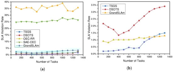 Figure 4a depicts the progression of the SLA violation rate as the number of tasks increases and when tasks are assigned according to different scheduling policies. If the server fails to complete a task before the user-specified deadline, the task is considered to be failed, and the service-level agreement is violated. The SLA violation rate is the percentage of all tasks that failed. A high SLA violation rate tends to cause task congestion and server overload, which is a devastating blow to the real-time performance of tasks in smart factories. Data show that SAE-CEC does have some optimizations over the default scheduling algorithm, but the DSOTS algorithm reduces the violation rate by 22.13%, and the greedy-optimized TSGS even reduces the SLA violation rate to 1.8%. The violation rate of all other algorithms increases as the task volume rises, while the TSGS and DSOTS violation algorithm considering time sensitivity decreases instead. Since the violation rate of TSGS, DSOTS, and GrandSLAm is too low, it needs to be magnified with Figure 4b to show their detailed values. With the increment of task number, the rates of OEC-RR and SAE CEC are both above 19.26% and hardly changed; TSGS can reduce the violation rate to less than 2%, and the optimization efficiency is better when the number of tasks more significant.As GrandSLAm focuses more on ensuring the improvement of throughput under SLA, the advantage of GrandSLAm will be revealed when the number of tasks increases.As Figure 4b shows, the SLAV ratio of GrandSLAm approaches that of TSGS after the number of tasks exceeds 1100. Each microservice stage slack of the directed acyclic graph (DAG) is calculated by GrandSLAm, and it is then reordered in accordance with . However, due to the influence of the hyperparameter , the largest sharing degree (the actual batch size during execution) after reordering is not stable when computing . However, when the number of instantaneous tasks becomes larger, the impact of the hyperparameter on the largest sharing degree decreases, leading to an increase in efficiency.