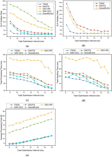 As shown in Figure 5a, the violation rates of different scheduling algorithms all decrease when the frequency of task arrivals decreases. However, since OEC-RR just selects servers cyclically and makes no judgments on task or server attributes, the changes in task density have less of an influence on this method. It is observed that the TSGS algorithm reduces the failure rates by 10–20%, and the SLA violation rate is lower than the other algorithms when the time interval between task arrivals is minimal. The proposed two algorithms are capable of dealing with the situation of dense task arrivals and handling task-intensive workloads with ease, which proves that the adoption of TSGS strategies will lead to higher task-carrying capacity in task-intensive scenarios.