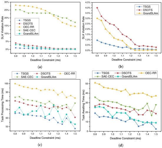 To obtain more details about the performance of all algorithms, the violation rate, average execution time, and average processing cost are compared under different degrees of deadline constraints, as Figure 6 shows. The number “1” (representing 45 ms) is set to the standard degree of deadline constraint, and the case of 500 dynamically submitted tasks is tested by varying the degree of deadline constraint. The results show that TSGS and DSOTS scheduling strategies outperform the other two algorithms in all cases. From Figure 6a,b, it is obvious that TSGS can respond flexibly to changes in the deadline strain to improve the processing success rate of time-sensitive applications, and it even reduces the failure rate to 0.95%, which means that TSGS can respond in a timely manner when users post urgent tasks. It is reasonable to accept that, except for the SAE-CEC algorithm, the violation rate of tasks will decrease as the deadline constraint gradually relaxes and the user’s completion time requirement is relaxed. SAE-CEC is less affected by external influences, and SLAV decreases slowly. For the reason that the deadline is a demand made by the user, it has no effect on the average processing time or cost of the workflow. The TSGS reduces the processing time by 17.6% compared to SAE-CEC and by 31.3% compared to OEC-RR. However, the processing time and cost of the task do not differ much under the same scheduling policy as well.