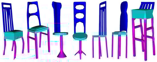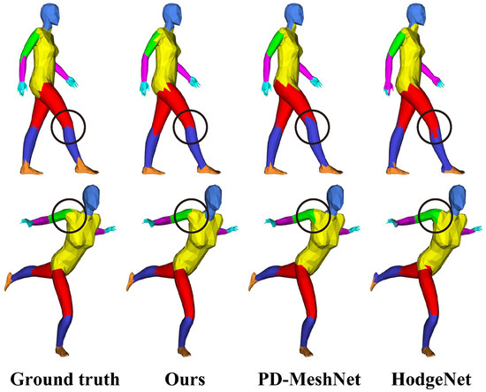 COSEG [30] contains three types of models: aliens, vases and chairs. There are 200, 300 and 400 models in each category, and each model is divided into three or four parts. Each category was divided into 85% for training and 15% for testing. We used the hard labels of the edges to visualize and make a qualitative comparison with MeshCNN [14], as shown in Figure 7. We report the accuracy for some recent methods in Table 2 and Table 3. Our method was found to have an accuracy close to, or even better than, the state-of-the-art methods.