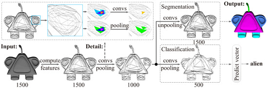 Another approach treats the meshes as graphs. Some methods regard the mesh as a special case of a graph structure, and use graph convolution to extract the vertex features [11,12]. PD-MeshNet [13] is unusual, involving the conversion of mesh faces and edges into primitive and dual graphs for convolutions, and introducing pooling of vertex merging, without excessive attention to the topology of the triangular mesh.