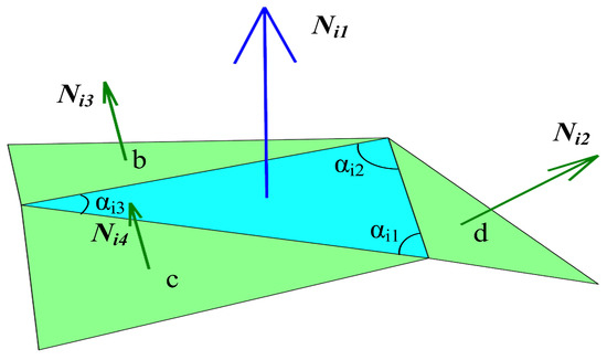 Six dihedral angles. Given the the four normal vectors () of a face and its adjacent faces shown in Figure 3, we calculate six dihedral angles using the two combinations of normals according to the order of the faces in as:
