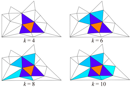 Visualization of the convolution receptive fields of different kernel size k. The orange parts are the center faces, which, together with the blue faces, constitute the convolutional receptive fields of the center faces.