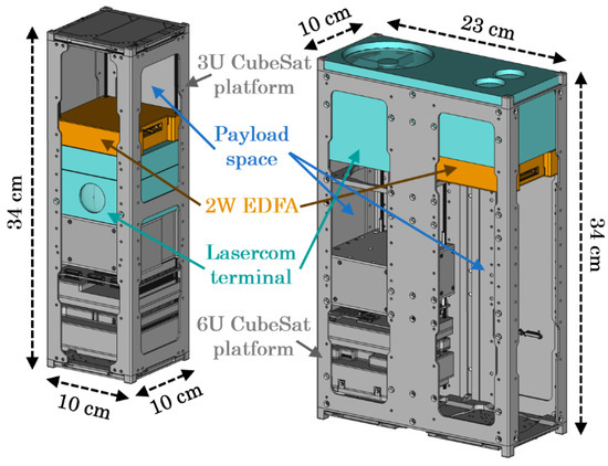 Three-dimensional model of CubeSOTA showing the EDFA within the lasercom terminal and its impact on the CubeSat’s platforms.
