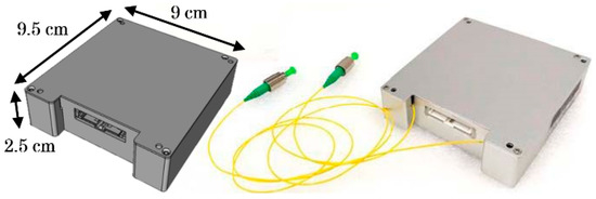 Since the EDFA must be compatible with the CubeSat’s form factor, its footprint was designed to be 90 mm × 95 mm, and its height was optimized to fit in a case as small as 25 mm (Figure 2) with a total mass of 430 g. The EDFA’s interface is made up of power and control. The former requires one line of 3.3 V and one of 5 V, which are common in the CubeSat platform. For the latter, the EDFA’s internal microcontroller is equipped with a universal asynchronous receiver-transmitter (UART) port to communicate with the CubeSat’s onboard computer (OBC), although a UART-to-RS232 converter was developed for tests with PC.