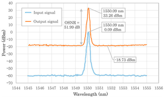Figure 4 shows the performance of the 2-W EDFA using an optical spectrum analyzer (OSA) for an input-signal’s wavelength of 1550 nm. The OSA spectrum shows the 2-W level at 33.26 dBm and the noise due to the amplified spontaneous emission (ASE) at −18.73 dBm. The EDFA provides an equally approximated saturated gain when the input power is within −6 dBm and 3 dBm. However, the ASE noise is proportional to the input power, going from −15.2 dBm/0.1 nm at −6 dBm to −21.6 dBm/0.1 nm at 3 dBm. Therefore, the input power should be kept as small as possible within its tolerable range to optimize the optical signal-to-noise ratio (OSNR), which is 51.99 dB when input power is 0 dBm.