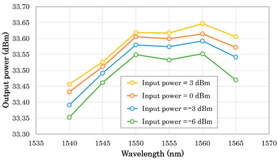 Dependency of the EDFA’s output optical power with wavelength for different levels of input optical power.