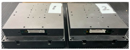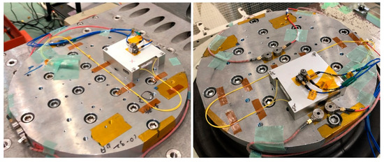 The sinusoidal vibration tests consisted of a functional verification before and after applying a sine sweep within the range of 5–140 Hz (vibration amplitude of 2.5 g in the range of 5–100 Hz and 1.25 g in 100–140 Hz, with 1 g being the unit of measure of acceleration, equals to 9.80665 m/s2 in the International System of Units) with 3 repetitions for each orthogonal axis. The functional tests before and after random vibration were performed during 2 min for each test with 3 repetitions for each orthogonal axes within the range of 20–2000 Hz. As shown in Figure 7, the vibration tests were performed in two different vibration instruments, one for horizontal vibration (X-Y) and one for vertical vibration (Z). The output optical power was measured before and after each test with no significant variation that could be attributed to the vibration tests, in the order of 0.1 dB.
