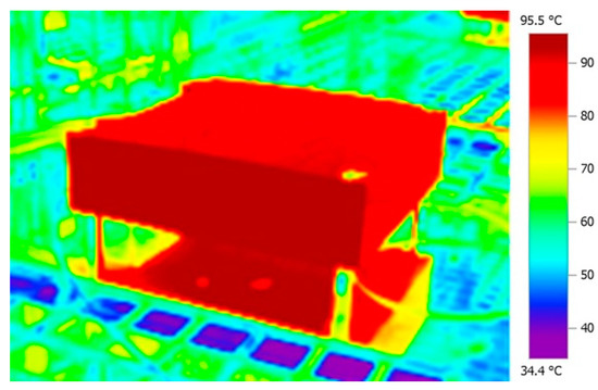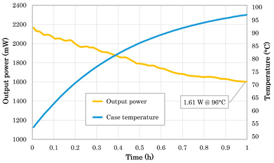 A prototype module of the CubeSat’s EDFA was used several months before the final TVT for a preliminary functional long-duration test under high-temperature vacuum (hot cycling). The result of this test can be seen in Figure 8, which shows the dependence of the output optical power on the EDFA’s temperature during one hour of continuous operation starting at a temperature of +55 °C. The EDFA’s typical behavior can be confirmed, with the output power dropping as the temperature rises. Figure 9 shows a picture of the EDFA’s module in the final stage of this test when its case temperature reached about +90 °C.