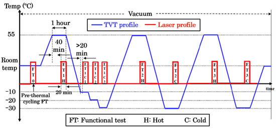 The final thermal vacuum tests were performed within a vacuum range of 10−6 to 10−7 mbar and a temperature range of −30 °C to +55 °C with a temperature variation rate of 1 °C/min. As shown in Figure 10, multiple functional tests were carried out, with the main emphasis on maintaining a dwell time of 1 h at extreme levels (−30 °C and +55 °C) during three cycles each. The denomination of the functional tests depends on the cycle temperature and the sequential order. For example, FT1C is the first functional test of the cold cycles and FT3H is the third functional test of the hot cycles. All the functional tests during these extreme levels had a typical duration of 20 min.