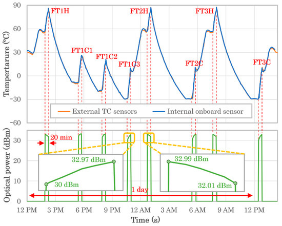 Figure 12 shows the result of the EDFA’s module functional verification during a continuous 24 h thermal vacuum test including three cold cycles and three hot cycles. The EDFA’s operation under extreme-temperature conditions can be understood from the results taken in this measurement campaign. The case temperature rises after the amplifier is enabled, which has a different impact on the optical output power depending on the temperature. The output power tends to fall when the temperature rises during the hot cycles and to rise with temperature during the cold cycles.