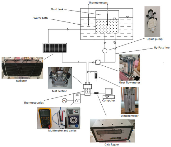 Nanofluids are innovative materials that are still being investigated for use in many different areas (solar collectors, automobile radiators, electronic devices, etc.) due to their higher thermal conductivity coefficients in cooling applications compared to commercial fluids. In addition, it is noteworthy that PHSs are preferred, especially in electronic cooling applications due to their high thermal performance. In the present study, the appearance of the experimental setup to examine the effect of using these two promising materials together on heat transfer and pressure drop for electronic cooling systems is given in Figure 1.