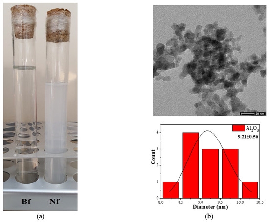In this study, ultrapure water, as the basic fluid, and Al2O3 nanoparticles with the trade name Aeroxide Alu130 (Evonik Ind. AG, Essen, Germany) were used to prepare the nanofluid. The appearance of both the base fluid and the nanofluid used in the study are given in Figure 4a. The density and surface area of Al2O3 nanoparticles were 3.27 g/cm3 and 130 ± 20 m2/g, respectively. The shape and size of the Al2O3 nanoparticles were examined with the FEI transmission electron microscope, which was set to 120 kV accelerating voltage. For the analysis, Al2O3-H2O dispersion was dropped on the carbon-coated copper grid and was dried. Particle size distribution and mean particle size of Al2O3 nanoparticles were determined from TEM images using the Image J program. As seen in Figure 4b, the particles have a spherical shape and a monomodal distribution. The mean particle size of the Al2O3 nanoparticles is 9.21 ± 0.56 nm. The properties of the Al2O3 nanoparticles are given in Table 2.