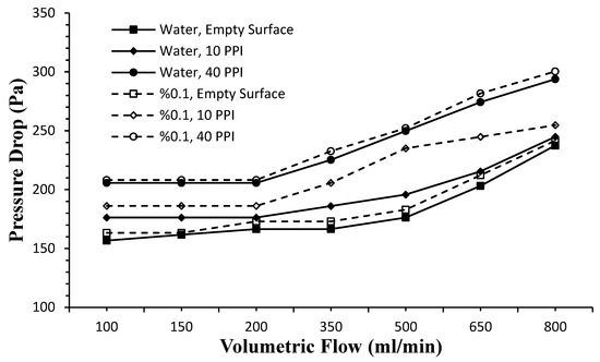 In the present study, the effects of the combined use of the nanofluid and PHS on heat transfer and pressure drop were investigated experimentally, and the Al2O3-H2O nanofluid was used as the cooling fluid at a concentration of 0.1% (w/w) by mass. Experiments were carried out for all surfaces (empty, 10 PPI and 40 PPI) at 454.54 W/m2 and 1818.18 W/m2 constant heat flux and volume flow range from 100 mL/min to 800 mL/min. The results were compared with the heat transfer and pressure drop results obtained with the base fluid. In Figure 5, the change in the pressure drop for both the nanofluid and the base fluid according to the volumetric flow rate is given. When the nanofluid was used as a cooling fluid, an increase in pressure drop was observed for all surfaces. The increase in pressure drop with the use of the nanofluid compared to the base fluid increased further with the addition of PHSs. It was determined that the pressure drop in the heat sink with a pore density of 40 PPI is higher than that of the 10 PPI for both fluids. The larger the pore density, the greater the web connection intensity, resulting in increased flow resistance. There was no significant change in pressure drop for all conditions at low volumetric flow rates (≤200 mL/min). However, when nanofluid was used at flow rates greater than 200 mL/min, an increase in the pressure drop gradient from 7.29% to 17.94% was observed in the 40 PPI PHS compared to the 10 PPI PHS. In addition, in the case of using the base fluid, an increase in the pressure drop gradient from 20% to 27.50% was observed.