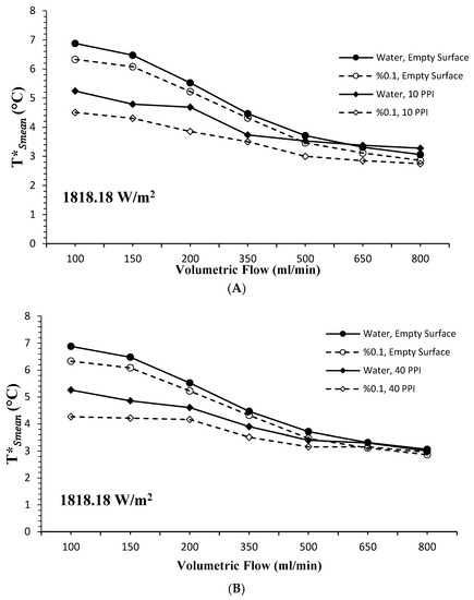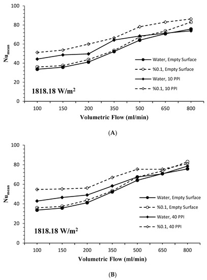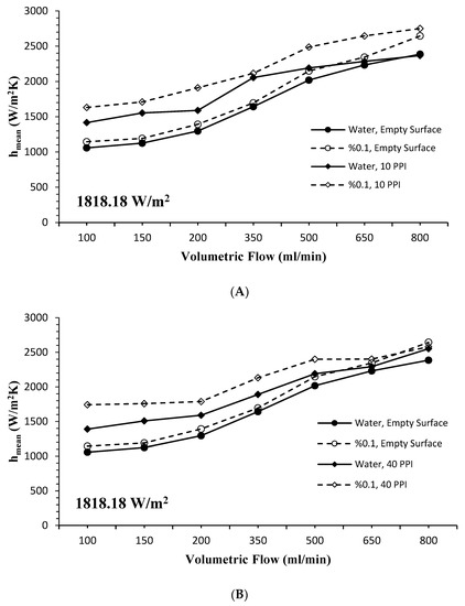 As a result of using both the nanofluid and PHS (10 PPI and 40 PPI), the variation of average surface temperatures according to volumetric flow at 1818.18 W/m2 constant heat flux are given in Figure 6A,B. When both figures were examined together, with the use of the nanofluid, a significant decrease in the average surface temperature was observed on all surfaces compared to the base fluid. In the case of using a 10 PPI PHS, it was seen that the nanofluid lowered the surface temperature more than the base fluid (Figure 6A). In addition, when the data obtained from the 10 PPI PHS were compared with the empty surface, it was determined that the surface temperatures decreased significantly. While the difference between the surface temperatures was more pronounced in all cases at low volumetric flow rates, the surface temperatures approached each other with the increase in the volumetric flow rate. Results from the use of 40 PPI PHS under the same conditions are given in Figure 6B. Compared to 10 PPI PHS, the surface temperatures of 40 PPI PHS were seen to be close to each other.
