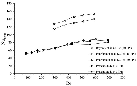 The variation of the Nusselt number with respect to the Reynolds number as a result of using 10 PPI and 40 PPI PHS with nanofluid is given in Figure 9, together with different studies in the literature. As in the other studies, the Nusselt number increased with the increase in the Reynolds number with the use of nanofluids. In addition, it was seen that the Nusselt numbers obtained as a result of using nanofluid in both PHSs were of the same magnitude as the studies mentioned. However, the results obtained from the studies were different due to the use of PHS with a different foam structure, as well as the geometry, design and measurement parameters of the test region.