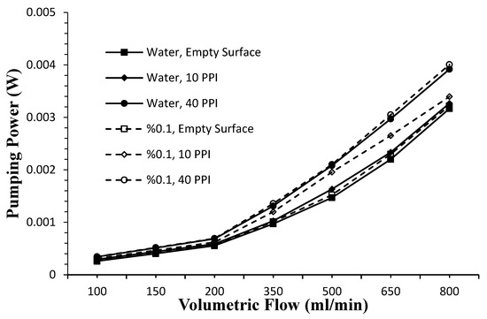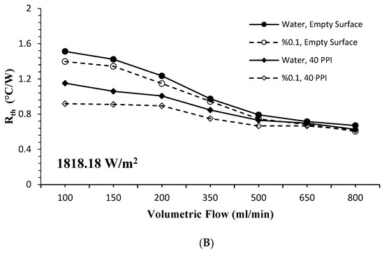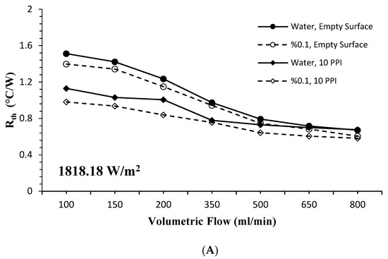 In the case of using 10 PPI and 40 PPI PHS with the nanofluid, the change in thermal resistance according to the volumetric flow were given in Figure 10A,B. A significant reduction in thermal resistance occurred at 10 PPI and 40 PPI PHS for both the base fluid and the nanofluid compared to the empty surface. Thermal resistance is a measure of a system’s ability to remove heat, and it varies inversely with heat transfer. A 6.33% decrease in thermal resistance was observed with the use of the nanofluid on the empty surface compared to the base fluid. With the use of 10 PPI and 40 PPI PHSs, a decrease of 16.9% for the base fluid and 23.48% for the nanofluid was determined.