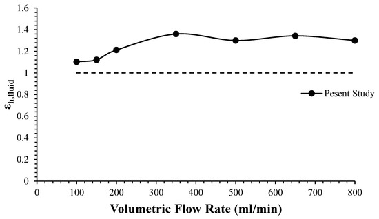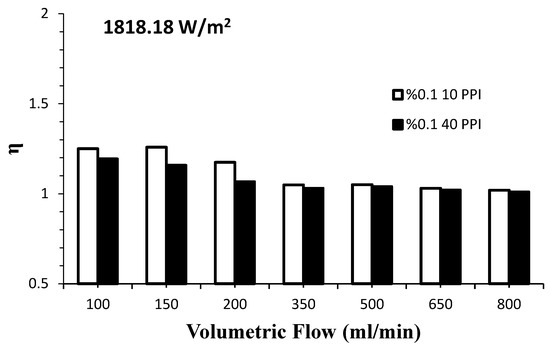 The thermal performance of the nanofluid used for the empty surface at a heat flux of 454.54 W/m2 compared to the base fluid is given in Figure 11. As seen in the figure, the thermal performance increased with the use of the nanofluid compared to the base fluid. In addition, the thermal performance value of the nanofluid increased with increasing volumetric flow. With the increase in volumetric flow, slight fluctuations in thermal performance occurred at certain values. These fluctuations in thermal performance values were due to the inability of the nanofluid to find sufficient contact time with the surface due to the increase in volumetric flow. Similar results were seen in the study of Khaleduzzaman et al. [46] examining the use of nanofluids in the cooling of electronic systems.