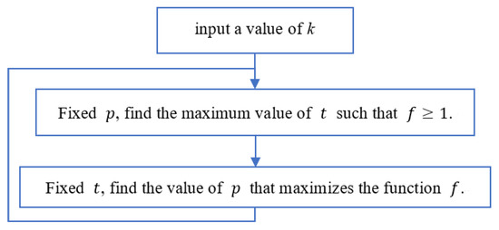 For a given k, the maximum value of t satisfying Equation (1) is useful in searching the lower bound of . We design an algorithm that can find rapidly the maximum value of t such that , for . Let . Figure 1 is the flowchart of the algorithm. When fixing t, the maximum value of the function f can be obtained for .