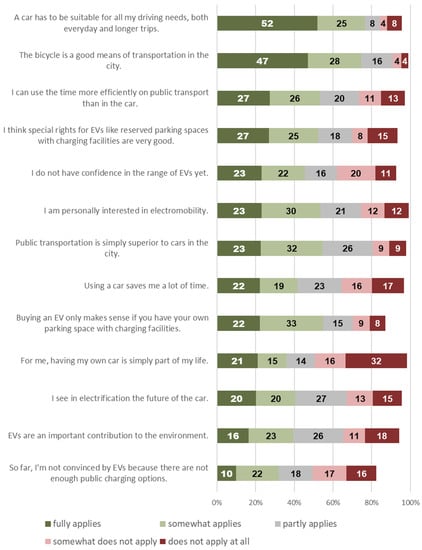 To ensure the linkage to the data from the national household travel survey ”Mobility in Germany” (MiD 2017), identical questions were asked [42]. In the city of Hamburg, almost 15,000 people took part in the MiD in 2017. They reported a total of 45,000 trips and answered general questions about mobility. Persons with a high interest in electromobility can thus be linked to the overall distribution in Hamburg.