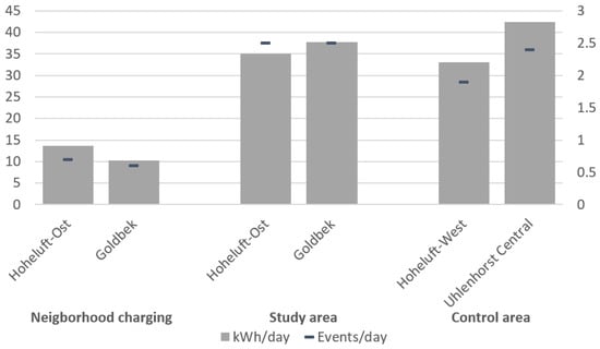 All charging stations (neighborhood charging and openly accessible) are operated by the local grid operator Stromnetz Hamburg. In the backend, comprehensive data on each charging process are recorded. The data cover information on the location of the charging station, date and time of start and end of the process, charging power, energy consumed, and user ID. The data are derived directly from Stromnetz Hamburg. Unrealistically short events with no transmitted energy as well as data resulting from service operations by the operator were removed. After validating and cleaning the data, a total of 18,811 charging events were included in the analyses. 863 events took place at eight neighborhood charging stations with a reservation option. 17,948 events were assigned to 50 openly accessible charging stations, both in the study area and in the control area. The period under observation was filtered from 1 October 2021 to 28 February 2022.