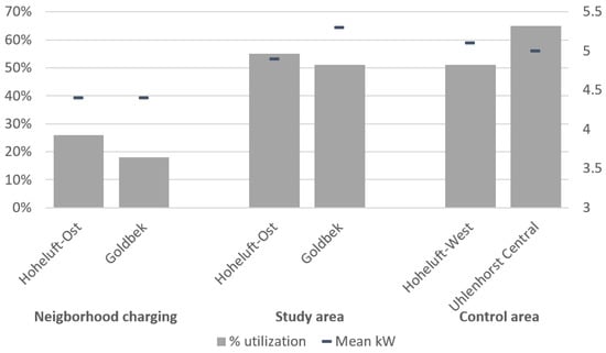 To evaluate utilization of the infrastructure, we draw two comparisons. On one hand, we compared the utilization of charging stations with a reservation option to the utilization of nearby charging stations in the same study area (the districts of Goldbek and Hoheluft-Ost). On the other hand, we evaluated the utilization in the control area, which has no implementation of additional charging stations with a reservation option but is of a similar structure than the study area. To define the control area, we used the statistic units as smallest common administrative division. Selecting the control area was based on data in several categories regarding location, size, inhabitants, number of vehicles, number of EVs, vehicles and EVs per 1,000 inhabitants, number of public charging stations, utilization rate of public parking spaces, and ratio between EV and charging stations.
