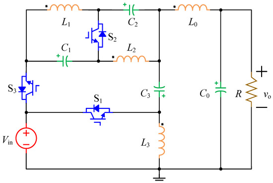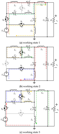 The working state 1 is shown in Figure 3a. The switches S1 and S3 are turned on and S2 is off. The input source charges the inductor L3 and capacitor C3 through the switch S1, and charges the inductor L1, L2 and capacitors C1 and C2 through S3. According to Kirchhoff’s law, the variables of working state 1 are expressed as follows: