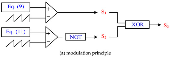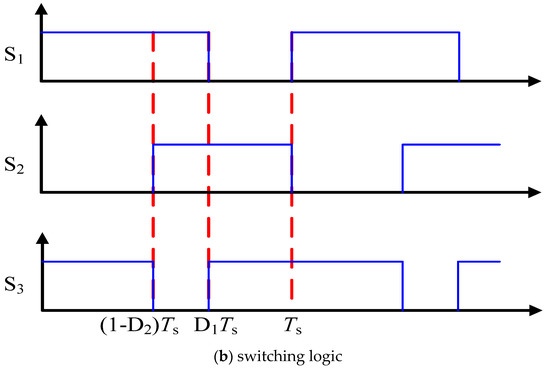 The new topology modulation process is shown in Figure 4: First, D1 is determined according to (9), and then D1 and the carrier signal are input to the comparator at the same time to get the driving signal of switch S1. D2 is determined according to (11), then D2 and the carrier signal are input to the comparator at the same time. After that, the driving signal of the switch S2 is obtained through the NOT gate. Finally, the driving signal of S3 is obtained by passing the driving signal of S1 and S2 through the XOR gate.