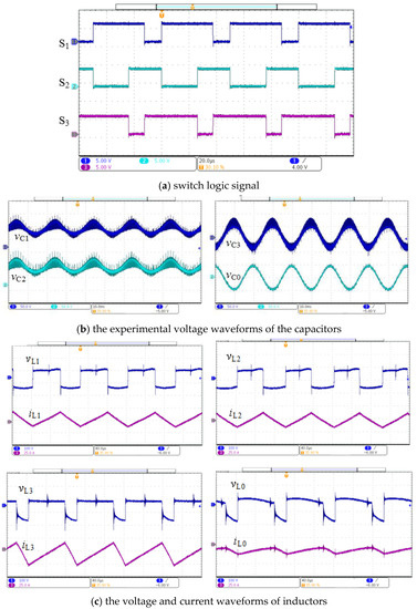 Figure 5a shows the experimental waveform of the switch drive signal, which is the driving logic signal of the switches S1, S2 and S3 respectively from top to bottom. It can be seen that only two switches of S1, S2 and S3 are turned on at the same time, which is in accordance with the theoretical analysis and design of Figure 4. Figure 5b demonstrates the experimental voltage waveforms of the capacitors C1, C2, C3, and the output filter capacitor C0 in the inverter topology. Due to the circuit impedance network being symmetrical, the voltage waveforms of capacitors C1 and C2 are the same. On the other hand, the C3 and C0 voltages are raised, which validates the boost ability of the circuit. It should be noted that spikes occur on vc1, vc2, vc3. The main reason behind it is the high-frequency interference from the measurement due to the high-frequency switching operation in the circuit.