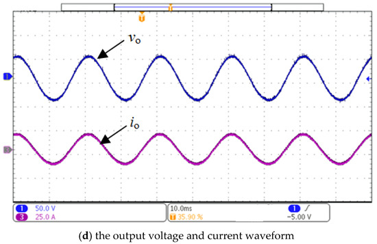 Figure 5c shows the voltage and current waveforms of the impedance network inductors L1, L2, the boost inductor L3, and the output filter inductor L0 in the topology. According to the inductor voltage and current waveform, it can be seen that when the forward voltage is added at both ends of the inductor, the inductor is in the charging state, and the inductor current rises, which is consistent with the theoretical analysis. Figure 5d shows the output voltage vo and current io waveform of the inverter. It can be seen that the proposed inverter can achieve sine wave output and boost ability at the same time. The total harmonic distortion of the output voltage is well below 5%, which meets the IEEE Std 519-2014. Therefore, the effectiveness of the proposed scheme is validated.