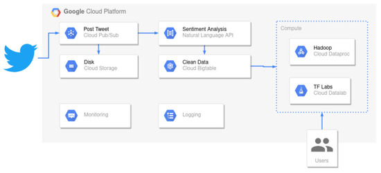 General Architecture implemented in Google Cloud Platform (GCP) [2]. This cloud-based architecture ingests tweets using the official Twitter APIs, sending each one of these through Google’s Pub/Sub, which uses as endpoints essential preprocessing, raw storage, and a serverless function to calculate the sentiment polarity. This function’s results are fed into BigTable through another Pub/Sub pipeline.