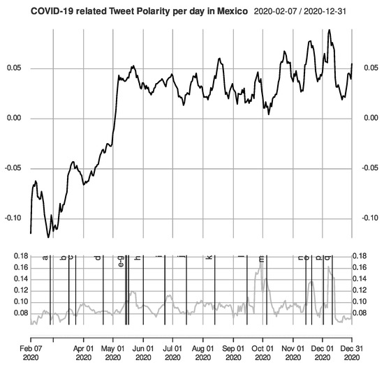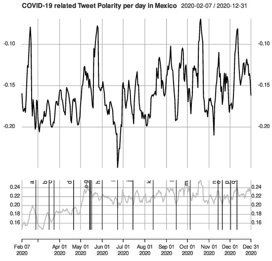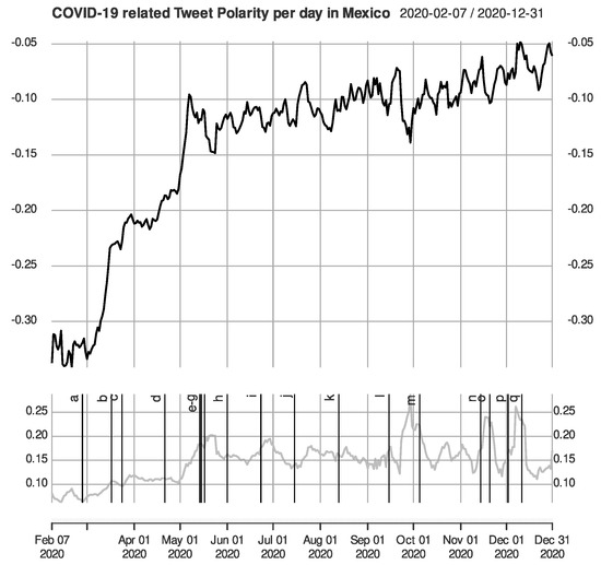 Year–Long time series of daily averaged compound sentiment polarity of COVID-19-related tweets in Mexico. Each line represents a time series based on the same dataset collected [6] and restricted to Mexico, from 2 February to 31 December 2020. Data were smoothed via a 7-day rolling mean.