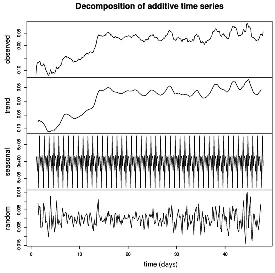 Table A1 summarizes the partial autocorrelation function indexes. We observed strong indications of weekly autocorrelations, which helped us quickly find the correct coefficients for fitting an ARIMA model and use it to decompose the time series.