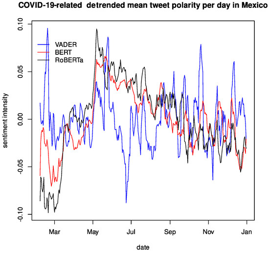 We performed a sentiment analysis on COVID-19-related tweets posted in Mexico from 1 February 2020 to 31 December 2020, forming a corpus of 760,064,879 tweets, which after preprocessing and filtering came to a total of n = 2,142,890 utilized tweets, retrieved from the COVID-19 Twitter chatter dataset [6]. Note that the ranges of polarity values went from (i.e., entirely negative) to 1 (i.e., completely positive), where 0 was considered a neutral value or an utterly objective tweet (but given that these tweets were for the most part opinions, this was rarely the case). We performed this sentiment polarity determination using three language models: VADER, BERTweet, and RoBERTa. Table 3 presents a monthly summary of the sentiment polarity for a given month, but the analysis was performed with daily granularity.