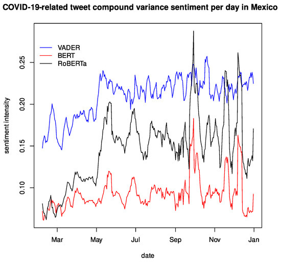 Year–long time series of daily averaged compound sentiment polarity variance of COVID-19-related tweets in Mexico. Each line represents a time series based on the same dataset collected [6] and restricted to Mexico, from 2 February to 31 December 2020. Data were smoothed via a 7-day rolling mean.