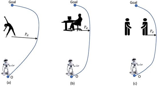 Human-friendly navigation capabilities of a service robot would enhance the overall interaction between the robot and a user, ultimately increasing user satisfaction [28,29]. A service robot should be capable of maintaining a proper distance and direction with a user while approaching the user or navigating toward a goal. This scenario can be explained by the example shown in Figure 1, which represents a robot navigating from the initial position ‘O’ to the goal position in different contexts. In Figure 1a, a person is doing an exercise, and movements change rapidly. The person requires a large free space around him. Thus, the robot should maintain a long distance with the user during the navigation in this case. A situation where a person works with a computer while sitting is depicted in Figure 1b. In this case, the distance to be maintained by the robot should be less than the exercise scenario. Apart from single-person scenarios, there can be multi-person scenarios, as depicted in Figure 1c, where two persons have a conversation. In this scenario, the robot should navigate toward the goal without hindering the ongoing conversation by obeying social etiquette. Therefore, Human–Robot Proxemics (HRP) plays a vital role when navigation in human-populated environments.