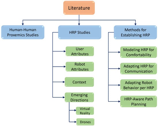In this regard, this paper presents a review of the literature on HRP. The literature reviewed in this paper was selected by exploring major indexing databases such as Web of Science, SCOPUS, and Google Scholar. Nonpeer reviewed, or unpublished manuscripts such as news items, theses and dissertations, web articles, and technical reports were excluded from the review paper. Books, chapters, and standards that could be used to provide supporting statements or additional information such as definitions are included in the paper. A major focus has been given to a journal in the case of the same concept was reported in two documents such as a conference paper and an extended journal article. Only the manuscripts published in English were considered for review. The gathered literature was taxonomically analyzed, and the taxonomy identified for the analysis is depicted in Figure 2. A discussion on explanatory studies on human–human proxemics is given in Section 2. Section 3 reviews the existing explanatory studies conducted to identify natural HRP behavior. Furthermore, a summary of the findings revealed by the studies is given to form a collection of facts related to HRP behavior. The state-of-the-art methods proposed for establishing HRP-aware behavior on service robots are reviewed in Section 4. The limitations of the current work and potential future work identified through the review are taxonomically presented in Section 5. Concluding remarks of the review are given in Section 6.