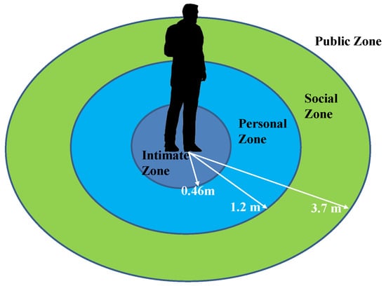 Anthropologist Edward T. Hall [30] introduced the term ‘Proxemics’ defined as “the interrelated observations and theories of humans use of space as a specialized elaboration of culture”. He conducted various experiments with human–human and human-animal to observe the variations of uses of space considering different contexts. This work could be considered the foundation work of proxemics. Although Hall’s proxemics experiments were conducted on Americans, the proxemics patterns in the cross-cultural context of Japan and Arabs have been deduced. Hall was inspired by Hediger’s [36] animal distance observations, wherein animal world, animals maintain distances such as fight distance and critical distance when different kinds of species meet. Similarly, he introduced distance zones that humans maintain with each other during different interaction contexts. His work reported four main proxemic zones. These zonal distributions can be represented as indicated in Figure 3. Each zone is subdivided into a close and far phase. The intimate distance—close phase is considered the physical contact or possibility of physical engagement. The distance range related to each zone is given below with their specific interaction context.