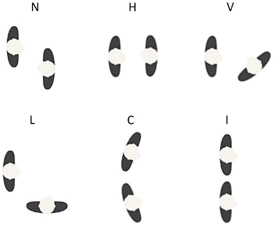 During multi-person gatherings, the people arrange formations and distances between them to exchange glances, words, and gestures comfortably. The work [39] introduced the basic space arrangement of persons defined as F-formation. The basic six F-formation are shown in Figure 4. The formations provide an amicable arrangement of people for the smooth and efficient performance of a given task. The work [39] introduced many situations that can apply these F-formation for two persons, such as at the setting edge (next to a wall or similar barrier), away from the setting edges (in an open, unstructured space), in the traffic line transecting a pedestrian setting (e.g., a plaza) and on a path transecting an open non-pedestrian setting (e.g., a lawn).