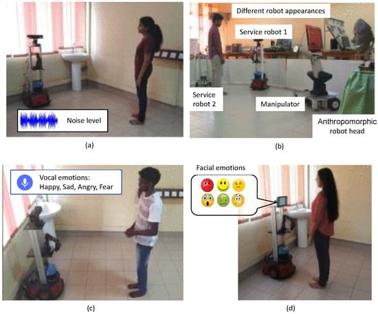 An overview of the HRP study conducted in [49]. (a): with internal noise levels of the robot, (b): An anthropomorphic robot head, (c): A manipulator, and (d): A service robot.