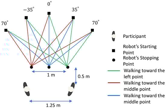 The variation of HRP according to the ways of approaching, a human toward a robot and a robot toward a human, has been studied in [40,41,46]. The studies concluded that HRP is not significantly dependent on these two approaching contexts. However, according to [46] users do not prefer closer HRP when a robot approaches a user in scenarios where the user’s mobility is restricted. The study [57] found that participants prefer a robot’s approaching from the right direction to hand over an object to a person sitting on a chair. Approaching from the front was the least preferred in this context. The work [58,59] conducted a user study for analyzing the stopping distance when a robot approaches two persons during a conversation. The robot was moved along different approaching paths as shown in Figure 6 when the two persons were sitting on the chairs, and the comfortable HRP decided by the participants was recorded. The outcomes of the study can be summarized as follows. In general, the preferred distance was outside of Hall’s personal zone. There is a significant effect of approaching direction on stopping distance and user comfortability. Users feel the highest comfortability when a robot approaches from the front, while the least comfortability can be observed from approaching the robot from −70° direction.