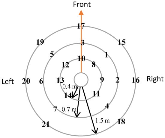 A proxemic planner for a robot that can determine appropriate HRP has been developed in [67]. The proposed proxemics planner utilizes a proxemic preference algorithm inspired by human–human and human–robot proxemic studies presented in [47,60]. The proxemic preference algorithm considers 21 possible target coordinates around a user, as shown in Figure 8. The inner two layers are utilized for physical interactions such as fetch and carry tasks, while the outer layer is configured only for verbal interaction. The default layer for the physical interaction is the middle layer, and the innermost layer is for experienced users. The proxemics planner can determine the appropriate HRP in a particular case by selecting one of the points among these predefined coordinates based on contextual factors. The approaching direction is considered to be in the frontal region of a user.