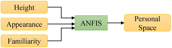 An Adaptive Neuro-Fuzzy Inference System (ANFIS) [69] has been developed to determine the HRP to be maintained by a service robot [70]. The ANFIS is capable of adapting HRP per the height of a user, a robot’s appearance, and user familiarity with the robot (overview of the ANFIS is given in Figure 9). A set of data collected from a human–robot user study conducted as a part of this work has been used to train and test the proposed ANFIS. The variation of human height has been considered in the range of 0.5 m–2 m. The appearance is considered human-likeliness, represented on a 1 to 5 scale. However, the deployment of the model on a robot has not been considered within the scope of the work. Moreover, the validation of the work is limited to testing with the data set.