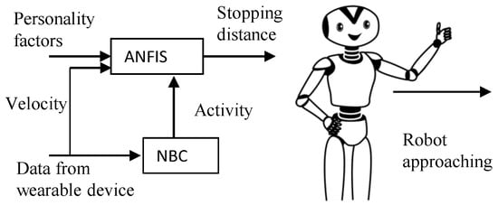 Another development of an ANFIS for determining HRP to improve user comfort could be found in [71]. The proposed ANFIS is capable of determining proper stopping HRP during an approach of a robot based on user activity and personality that have been developed. The configuration of the proposed system is explained in Figure 10. User activity is determined by a Naive Bayesian classifier (NBC) by analyzing the inertial measurements retrieved from a wearable sensor placed on a user. User activity, personality factors, and robot velocity are fed to the ANFIS as inputs. The personality factors are identified for each user through a questionnaire. The output of the ANFIS is the appropriate HRP for stopping the approach of a robot. Even though the robot is capable of adapting the proxemics based on user activity, the adaptation is limited to a small set of predefined activities (standing, sitting, walking, and laying). Thus, the proposed method would not be feasible for more activities.