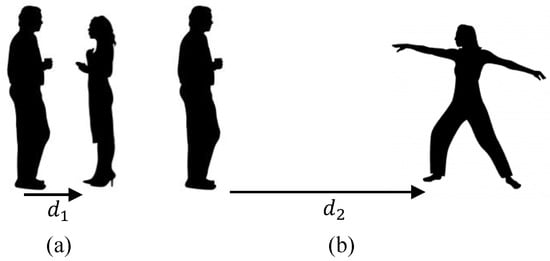 A method to determine the approaching proxemics for a service robot based on user behavior has been proposed in [72]. The method considers the dynamic movements of a human’s body joints to perceive the user behaviors instead of posture classification. Thus, the applicability of the method is not limited to a set of activities or posture categories. Furthermore, the system can vary the proxemics within the same activity based on how the user is performing an activity. The motivation of the proposed method can be explained with the example scenarios shown in Figure 11, where a human doing an exercise extending legs and arms in a wider manner requires a large interpersonal distance than a situation where arms and legs are not much extended. In the proposed system, dynamic body parameters perceived through an RGB-D sensor are used as inputs of a fuzzy inference system, where the output is the approaching proxemics of a service robot. A user study has been conducted by embedding the proposed method into a service robot. The user study has found that HRP determined by the proposed system is not significantly different from natural human–human proxemics.